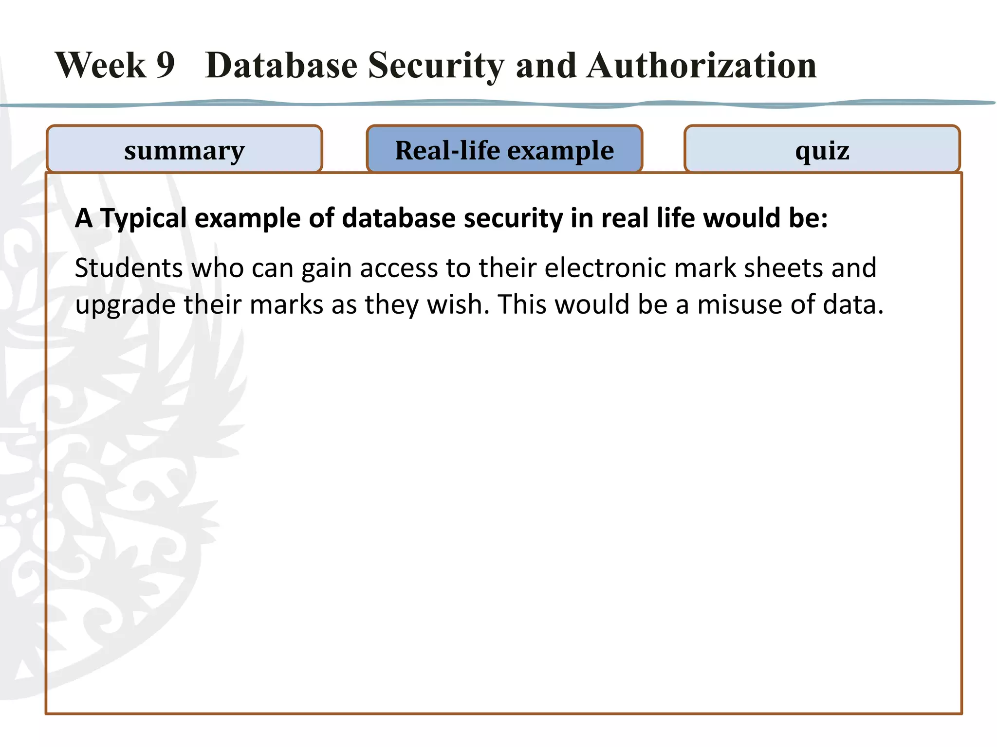 The document discusses database security and authorization. It covers threats to data security like human error and theft. Authentication verifies users' identities while authorization grants access privileges. Encryption encodes data for safe access. The document provides examples of improper authorization in schools and banks. It also includes a quiz on database security and authorization topics.