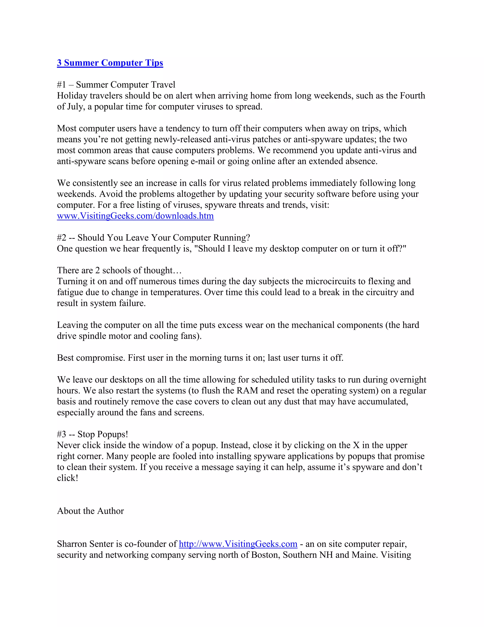 The document provides 3 tips for computer users during the summer: