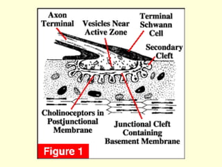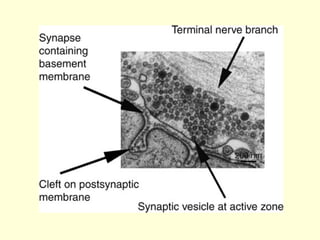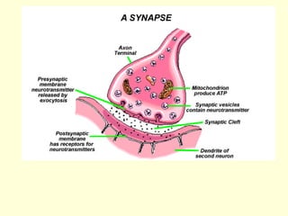 A synapse is the junction between neurons that allows electrical or chemical signals to pass from one cell to another. At a chemical synapse, an action potential in the presynaptic neuron causes neurotransmitters to be released into the synaptic cleft. These neurotransmitters then bind to receptors on the postsynaptic cell, causing ion channels to open and potentially triggering an action potential in that cell. Precise transmission of signals across synapses is crucial for normal nervous system function.