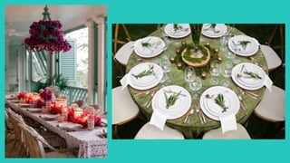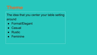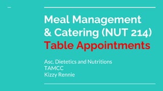 This document discusses various elements of table setting and meal service. It covers table linens, place settings, dinnerware, flatware, glassware, hollowware, and centerpieces. Proper care and storage is also outlined for each item. Table appointments should be chosen based on the occasion and theme, whether formal, casual, rustic, etc. Placement of all items is specified to ensure an elegant table setting.