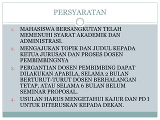 Dokumen ini menjelaskan tata cara pengajuan dan persyaratan penyusunan skripsi untuk mahasiswa konsentrasi di Universitas X. Terdapat informasi mengenai persyaratan administrasi dan akademik mahasiswa, proses pembinaan dan bimbingan skripsi, pelaksanaan seminar proposal dan ujian skripsi, serta penentuan nilai akhir.
