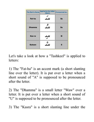 1) Arabic uses vowel marks called tashkeel to distinguish between long and short vowels in words. Tashkeel include fat-ha, dhamma, kasra, and sukoon marks above or below letters.