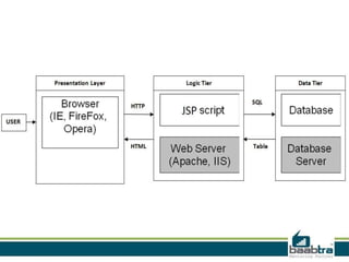 This document discusses 3-tier architectures. It begins by defining a 3-tier architecture as one with a client, middle, and database tier. The client tier handles the user interface, the middle tier contains most of the logic and communication, and the database tier manages the database. It then discusses thin-client and thick-client 3-tier models and provides examples of each. The rest of the document explains the roles and examples of the presentation, application logic, and database tiers. It concludes by listing some advantages of 3-tier architectures such as independence of layers, easier maintenance, reusability, and faster development.