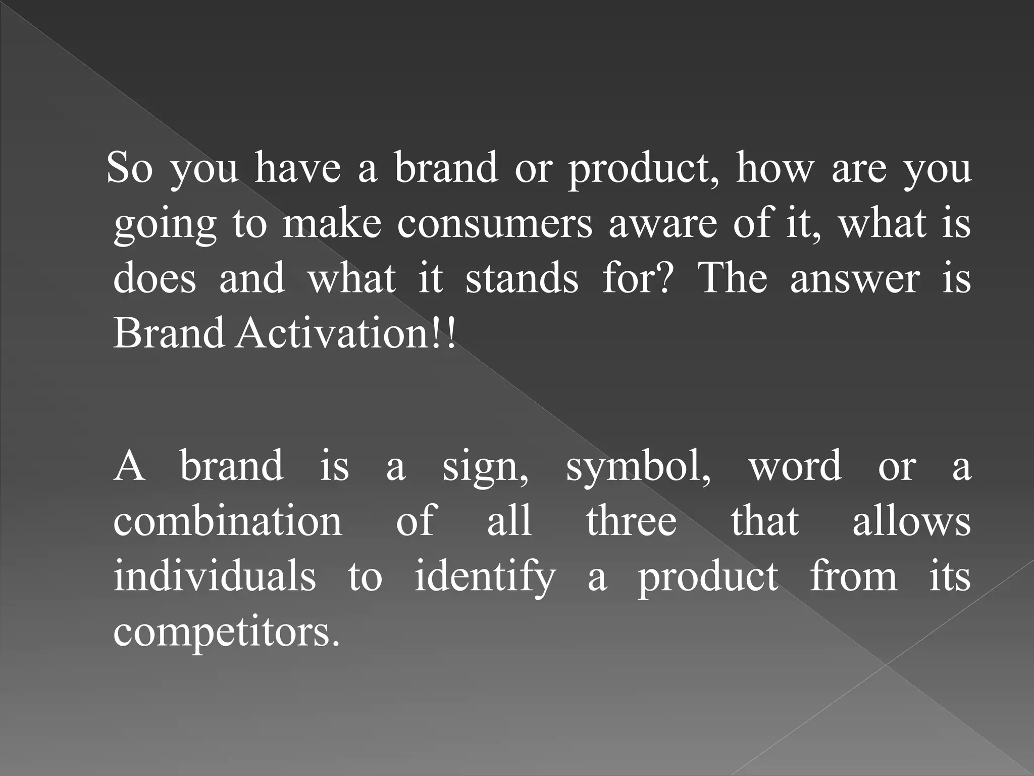 Brand activation is a strategy to create consumer awareness and trust in a brand by effectively presenting product information and ensuring appropriate product placement. It emphasizes the importance of a well-trained brand ambassador team to enhance consumer experiences and gather valuable data for continuous improvement. Overall, brand activation is essential for establishing a strong brand presence and gaining a competitive edge in the market.