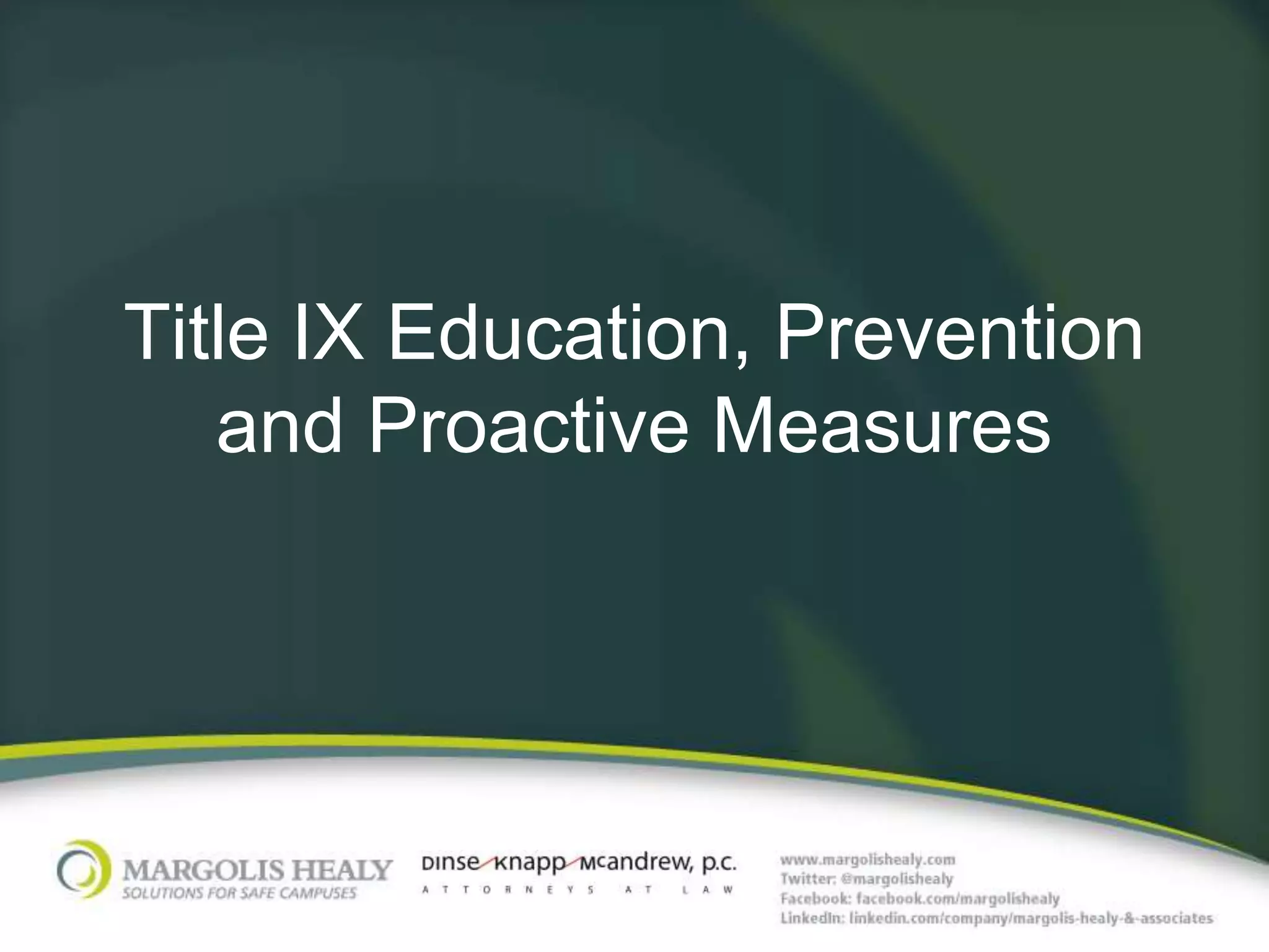 The document outlines the requirements and recommendations for implementing Title IX education and preventive measures against sexual harassment and violence in educational institutions. It emphasizes the necessity of training for all stakeholders, including administrators, staff, and students, to recognize and respond to incidents of harassment and violence. Additionally, it advocates for preventive education programs, comprehensive victim resources, and the development of materials that inform students and staff about their rights and reporting procedures.