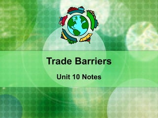Trade barriers such as tariffs and quotas can limit international trade between nations. While trade barriers protect domestic industries and jobs, they can also raise prices for consumers and decrease overall economic efficiency by reducing competition. Most economists agree that allowing free trade between countries is generally beneficial, as it allows goods and services to be exchanged at better prices, resulting in higher standards of living. However, some workers may lose jobs as their industries face more international competition.