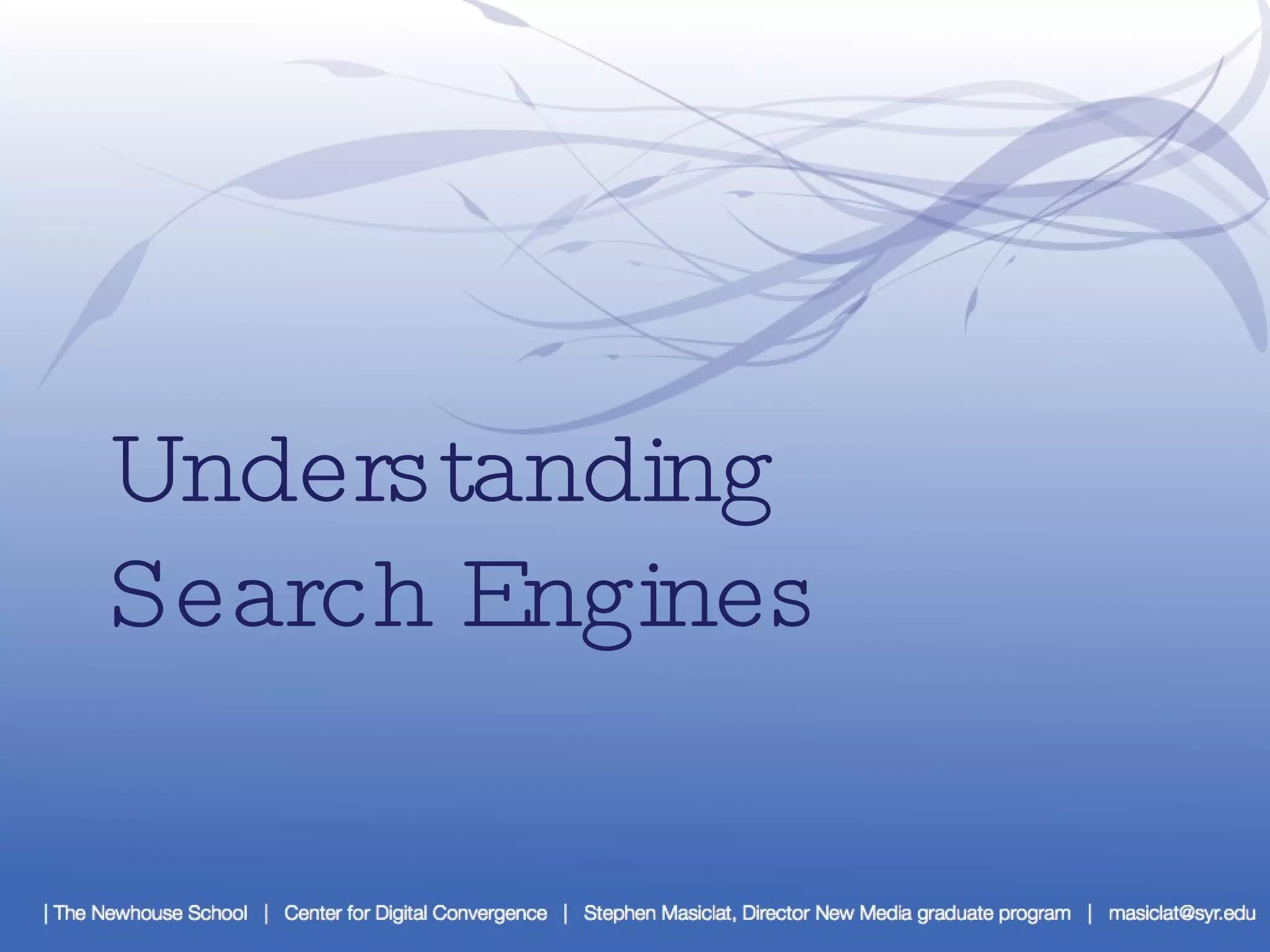 Search engines are designed to help users find information stored digitally. They aim to minimize the time and amount of information needed to find what users are looking for. Major methods of information retrieval for search engines include Boolean, vector space model, probabilistic, and meta search. Designing the perfect search engine requires dealing with challenges like the web's huge and constantly changing document set that is loosely organized through hyperlinks. Effective search requires components like crawlers to discover pages, repositories to store them, indexes for efficient searching, and ranking algorithms to order results.