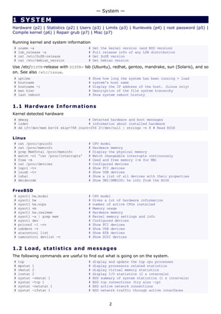 # pkill -TERM-u www # Kill TERM processes owned by www # fuser -k -TERM -m /home # Kill every process accessing /home (to umount) Important signals are: 1 HUP (hang up) 2 INT (interrupt) 3 QUIT (quit) 9 KILL (non-catchable, non-ignorable kill) 15 TERM (software termination signal) 3 FILE SYSTEM Disk info (p9) | Boot (p9) | Disk usage (p9) | Opened files (p10) | Mount/remount (p10) | Mount SMB (p12) | Mount image (p12) | Burn ISO (p12) | Create image (p13) | Memory disk (p14) | Disk performance (p15) 3.1 Permissions Change permission and ownership with chmod and chown. The default umask can be changed for all users in /etc/profile for Linux or /etc/login.conf for FreeBSD. The default umask is usually 022. The umask is subtracted from 777, thus umask 022 results in a permission 0f 755. 1 --x execute # Mode 764 = exec/read/write | read/write | read 2 -w- write # For: |-- Owner --| |- Group-| |Oth| 4 r-- read ugo=a u=user, g=group, o=others, a=everyone # chmod [OPTION] MODE[,MODE] FILE # MODE is of the form [ugoa]*([-+=]([rwxXst])) # chmod 640 /var/log/maillog # Restrict the log -rw-r----- # chmod u=rw,g=r,o= /var/log/maillog # Same as above # chmod -R o-r /home/* # Recursive remove other readable for all users # chmod u+s /path/to/prog # Set SUID bit on executable (know what you do!) # find / -perm -u+s -print # Find all programs with the SUID bit # chown user:group /path/to/file # Change the user and group ownership of a file # chgrp group /path/to/file # Change the group ownership of a file # chmod 640 `find ./ -type f -print` # Change permissions to 640 for all files # chmod 751 `find ./ -type d -print` # Change permissions to 751 for all directories 3.2 Disk information # diskinfo -v /dev/ad2 # information about disk (sector/size) FreeBSD # hdparm -I /dev/sda # information about the IDE/ATA disk (Linux) # fdisk /dev/ad2 # Display and manipulate the partition table # smartctl -a /dev/ad2 # Display the disk SMART info 3.3 Boot FreeBSD To boot an old kernel if the new kernel doesn't boot, stop the boot at during the count down. # unload # load kernel.old # boot 3.4 System mount points/Disk usage # mount | column -t # Show mounted file-systems on the system # df # display free disk space and mounted devices # cat /proc/partitions # Show all registered partitions (Linux) — File System — 9