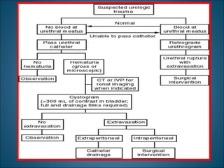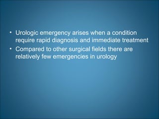 This document discusses genitourinary emergencies. It identifies the main non-traumatic emergencies as hematuria, renal colic, urinary retention, acute scrotum, and priapism. For each emergency, it describes the causes, presentations, differential diagnoses, and treatment approaches. In particular, it provides detailed information on the evaluation and management of testicular torsion, which is considered a true surgical emergency requiring prompt diagnosis and potential exploration to salvage the testis.