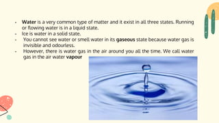 The document discusses the water cycle. It explains that water can exist in three states - liquid, solid (ice), and gas (water vapor). It also explains the processes involved in the water cycle, including evaporation, condensation, precipitation, transpiration, percolation, and how water moves between the sky, land, and oceans in continuous circulation.