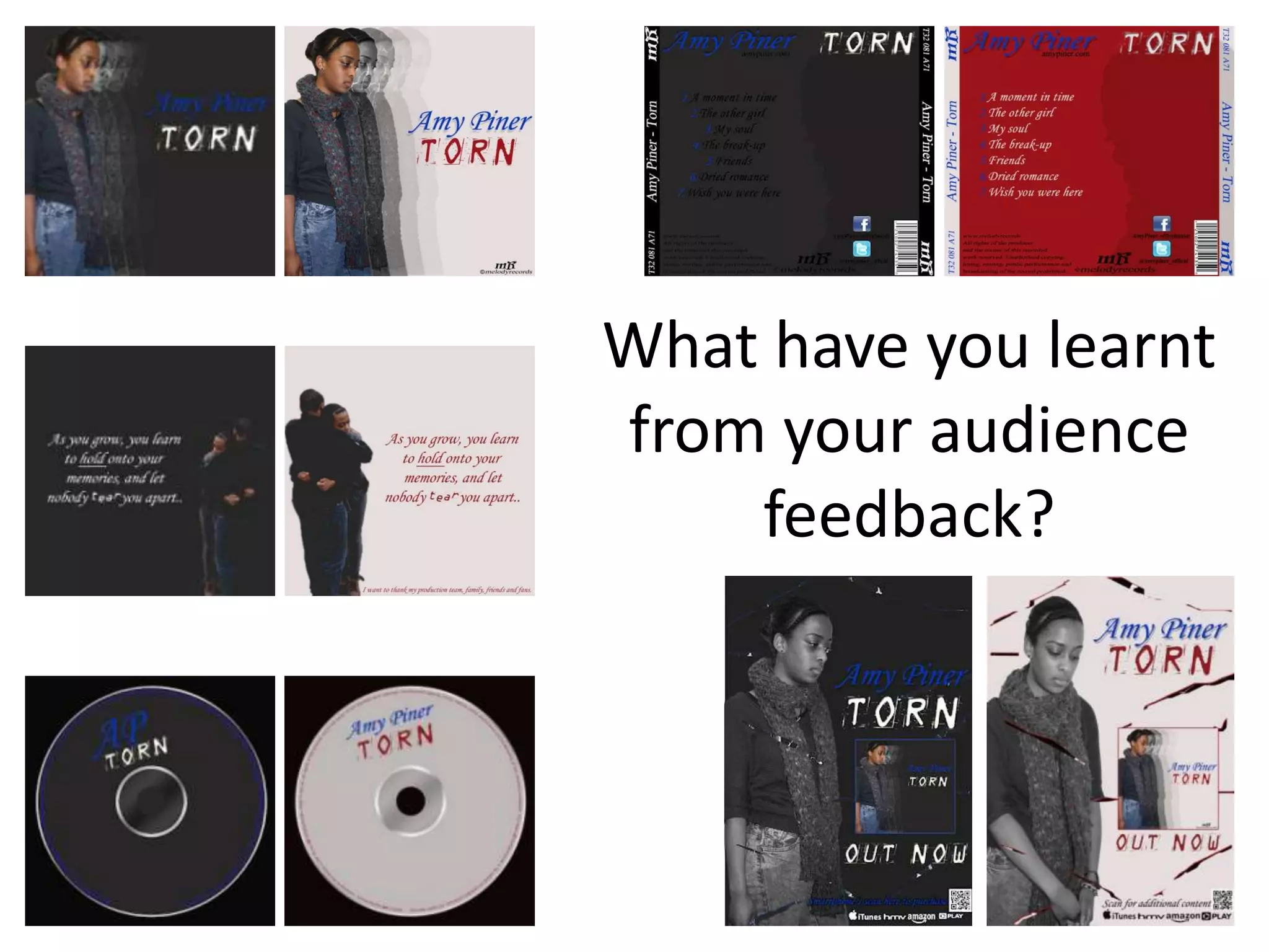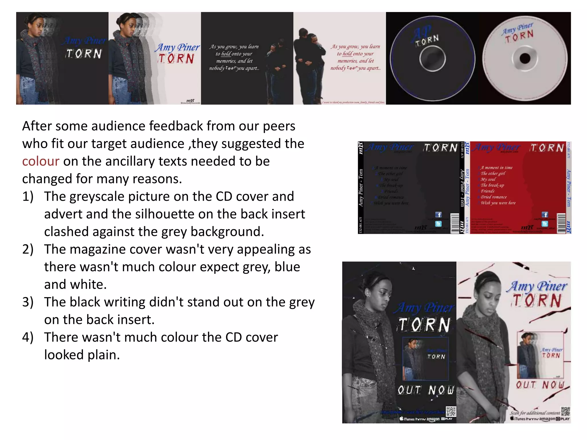 The document provides feedback from an audience on various marketing materials for a music release, including the CD cover, inlay, back insert, magazine advert, music video, and more. The feedback suggested changes to things like colors, layouts, images, and text to make the materials more visually appealing and clearly convey the intended messages. Suggested changes included adding more color to the CD cover, rearranging elements on the back insert, adjusting colors on the magazine advert to fit the overall scheme, and splitting screens in the music video to show two scenes simultaneously.