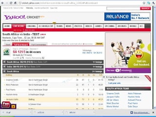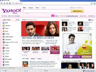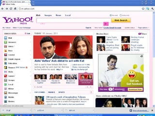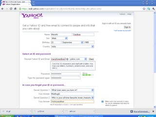 The document provides instructions on creating a Yahoo email account and using its features like sending emails and viewing cricket scores. It details the process of signing up, composing messages, and sending attachments. The author also promotes their own contact information and website for further resources.