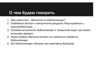Документ посвящен изменению роли библиотекаря в условиях цифровизации и открытости информации, а также проблемам и решениям, связанным с доступом к электронным ресурсам. Автор подчеркивает важность сетевого сотрудничества и профессионального роста библиотекарей для повышения качества обучения, предлагает новые модели взаимодействия с учащимися и раскрывает влияние технологий на библиотечное обслуживание. Обсуждаются актуальные вызовы и примеры успешных инициатив, направленных на развитие библиотечного дела в контексте современного общества.