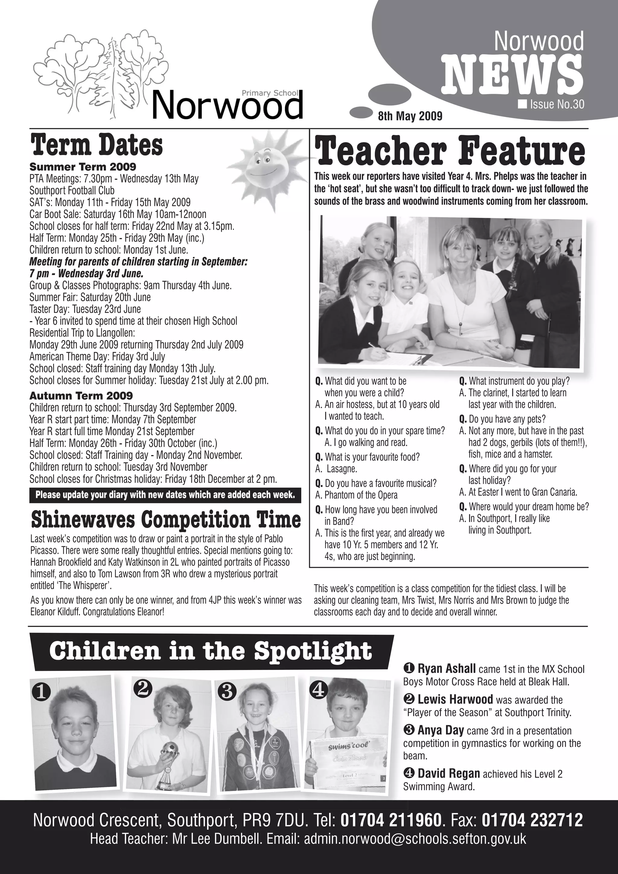 This newsletter provides information about upcoming events at Norwood school. It includes the term dates for summer 2009, notices about SATs, car boot sales, and teacher meetings. It also features an interview with Mrs. Phelps, the Year 4 teacher, and announces upcoming competitions for portrait drawing and tidiest classroom. Finally, it recognizes student achievements and provides updates about cross country races and preparations for the upcoming summer fair.