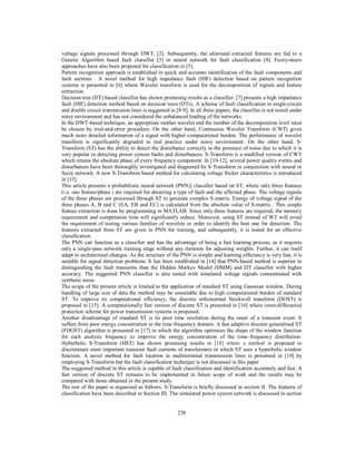 This document presents a technique for classifying faults on overhead transmission lines using S-Transform and a Probabilistic Neural Network (PNN) classifier. Voltage signals are processed using S-Transform to extract energy features from each phase. These 3 features (1 per phase) are used as inputs to a PNN classifier to determine the type of fault (e.g. line-ground, line-line) and faulty phase. The method was tested on a simulated 3-phase transmission line model in MATLAB with different fault conditions. It produced accurate classification results, even when noise was added to the signals. The paper concludes the method provides fast and accurate fault classification.