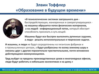 Документ обсуждает будущее образования в контексте технологических изменений и влияния цифровой революции на обучение и труд. Обсуждаются важные тренды, такие как искусственный интеллект, облачные технологии и онлайн-обучение, а также необходимость постоянного обучения для адаптации к новым требованиям рынка труда. Указываются на важность инновационных методов и гибкости в образовательных учреждениях для успешной подготовки студентов к вызовам современного мира.