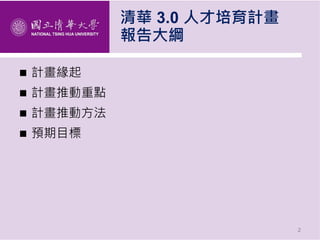 清華3.0人才培育計畫旨在重塑高等教育,強調學生自主學習、全人教育和社會責任。該計畫透過組織再造、課程重整和價值重塑,建立創新的學習生態系統,以培養具兼備科技與人文素養的一流人才。預期目標為提供多元化的招生管道和靈活的學習環境,激發學生的創新學習意願,促進背景多樣化學生的融入。