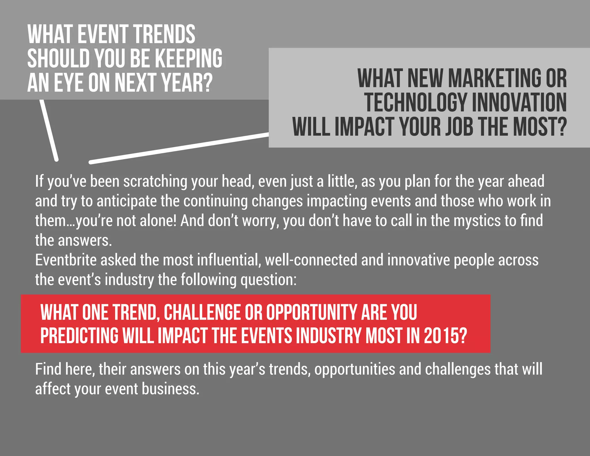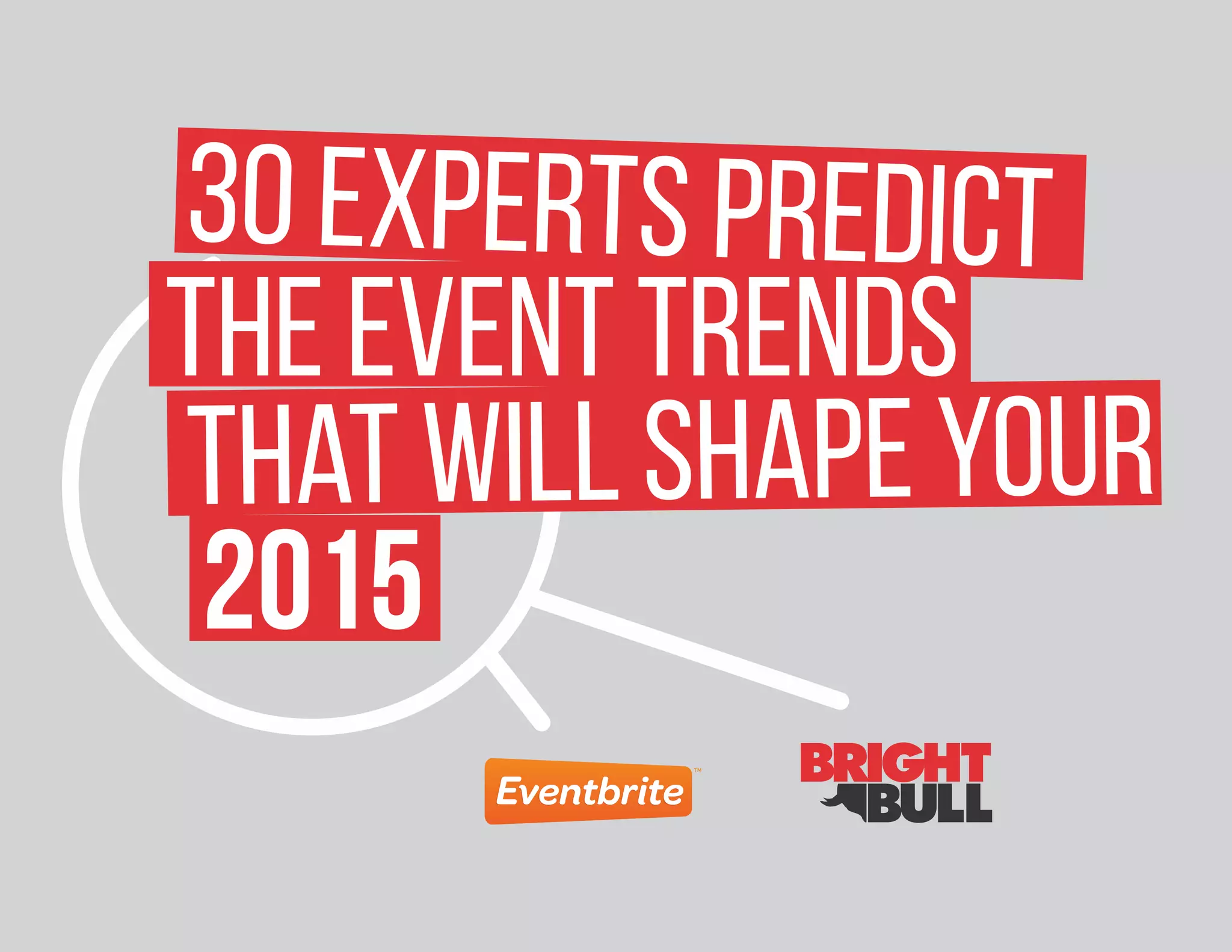 In 2015, the events industry will see significant trends such as increased focus on data analytics, the integration of technology in event management, and a shift towards experience-driven marketing particularly among millennials. Key challenges include managing budgets, maximizing attendee engagement, and leveraging social media effectively. Experts predict a need for simpler, smarter solutions as organizers navigate a complex landscape of marketing channels and tools.