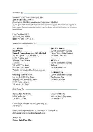 This document provides information about a book titled "30 Hadith for Children" including an introduction describing the hadiths selected for the book and lessons that can be learned from them. It contains the hadiths themselves translated into English along with summaries and discussion questions for each hadith. The book is intended to teach children about hadiths of the Prophet Muhammad in an easy way together with their parents or teachers.