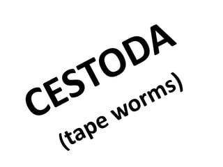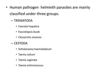 This document summarizes several human pathogen helminth parasites classified into three groups - Trematoda, Cestoda, and Nematoda. Key details are provided on the life cycles, transmission, clinical symptoms, diagnosis, treatment and prevention of Fasciola hepatica (sheep liver fluke), Taenia solium (pork tapeworm), Taenia saginata (beef tapeworm), Ascaris lumbricoids (human roundworm), Ancylostoma duodenale (hookworm), Wuchereria bancrofti (filarial worm), and Drancunculus medinesis (guinea worm).