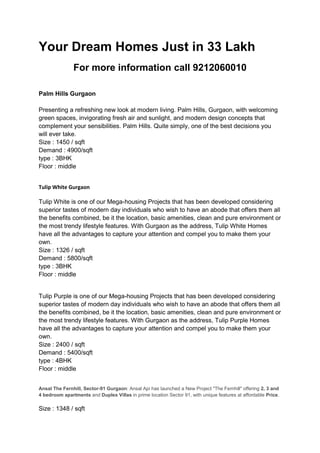 The document describes and provides details about several residential housing projects located in Gurgaon, including Palm Hills Gurgaon, Tulip White Gurgaon, Tulip Purple Gurgaon, Ansal The Fernhill Sector-91 Gurgaon, and a project by SARE Homes. For each project, the summary includes the size, demand price, number of bedrooms, and floor level. The document is advertising these new housing projects for sale.