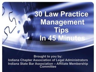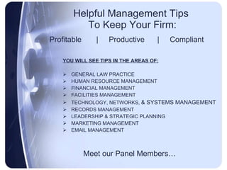 The document provides a comprehensive overview of 30 law practice management tips aimed at enhancing law firm profitability, productivity, and compliance, covering various management areas such as human resources, financial management, and technology. It features insights from panel members with extensive experience in legal administration, highlighting strategies for effective communication, financial oversight, and facilities management. The guidelines also emphasize the importance of strategic planning and leveraging technology to optimize law firm operations.