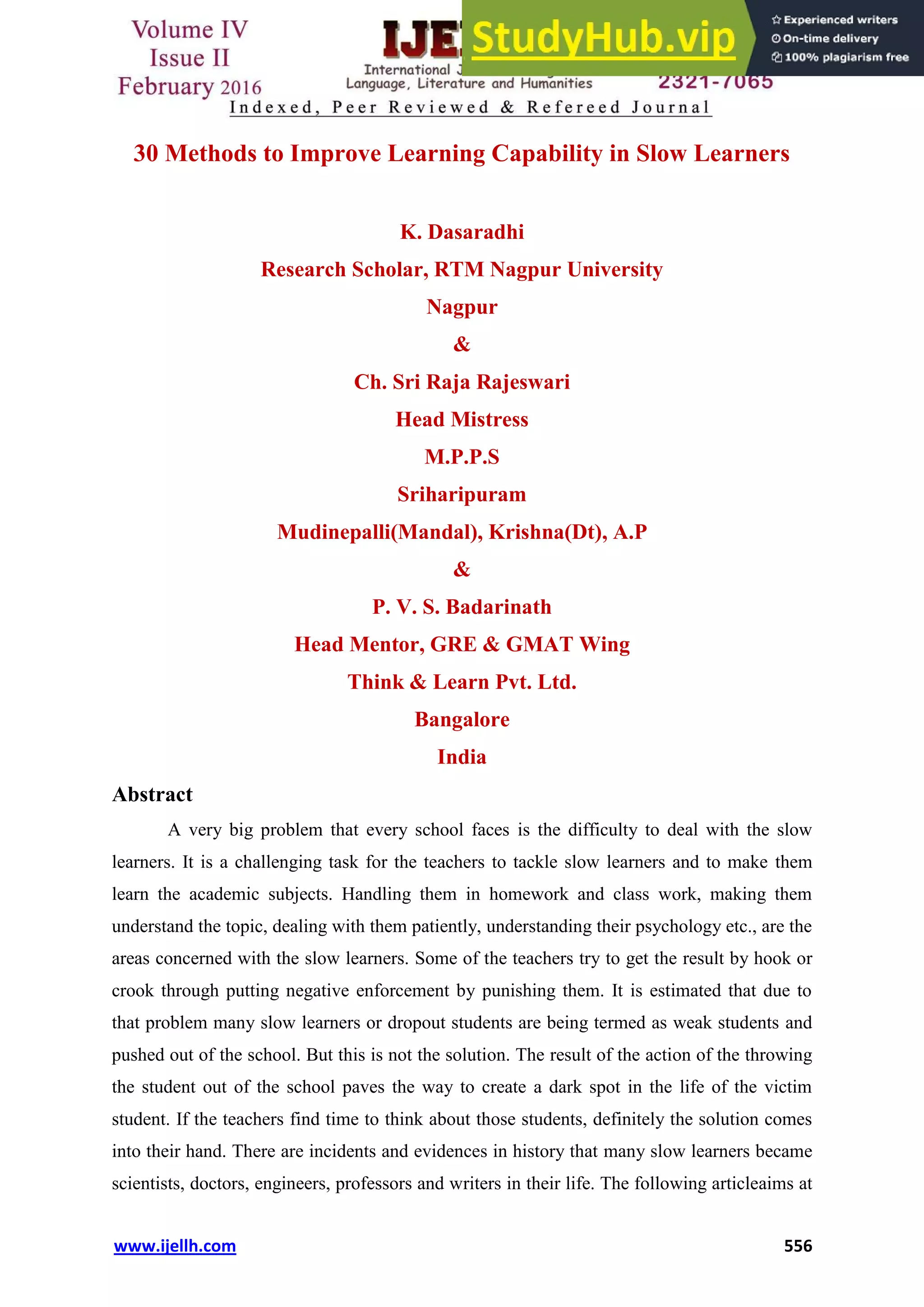 This document discusses 30 methods for improving learning capabilities in slow learners. It begins by defining slow learners as students who can achieve academically but work below average grade levels, scoring lower on IQ tests. Some key characteristics of slow learners are short attention spans, difficulty with abstract concepts, and careless work habits. The document then provides 30 specific methods teachers and parents can use, such as encouraging even small achievements, setting goals and timetables, providing memory tips, giving extra attention and guidance, addressing any physical or mental issues, and creating confidence in students' interest areas. Overall, the document aims to help teachers and parents better support slow learners.
