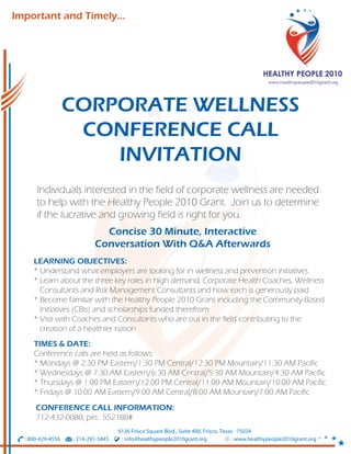 The document is an invitation to a corporate wellness conference call aimed at individuals interested in the corporate wellness field to assist with the Healthy People 2010 grant. Participants will learn about employer needs for wellness initiatives, high-demand roles in wellness, and community-based initiatives funded by the grant. Conference calls are scheduled on various days and times, providing an interactive platform for discussion and Q&A.