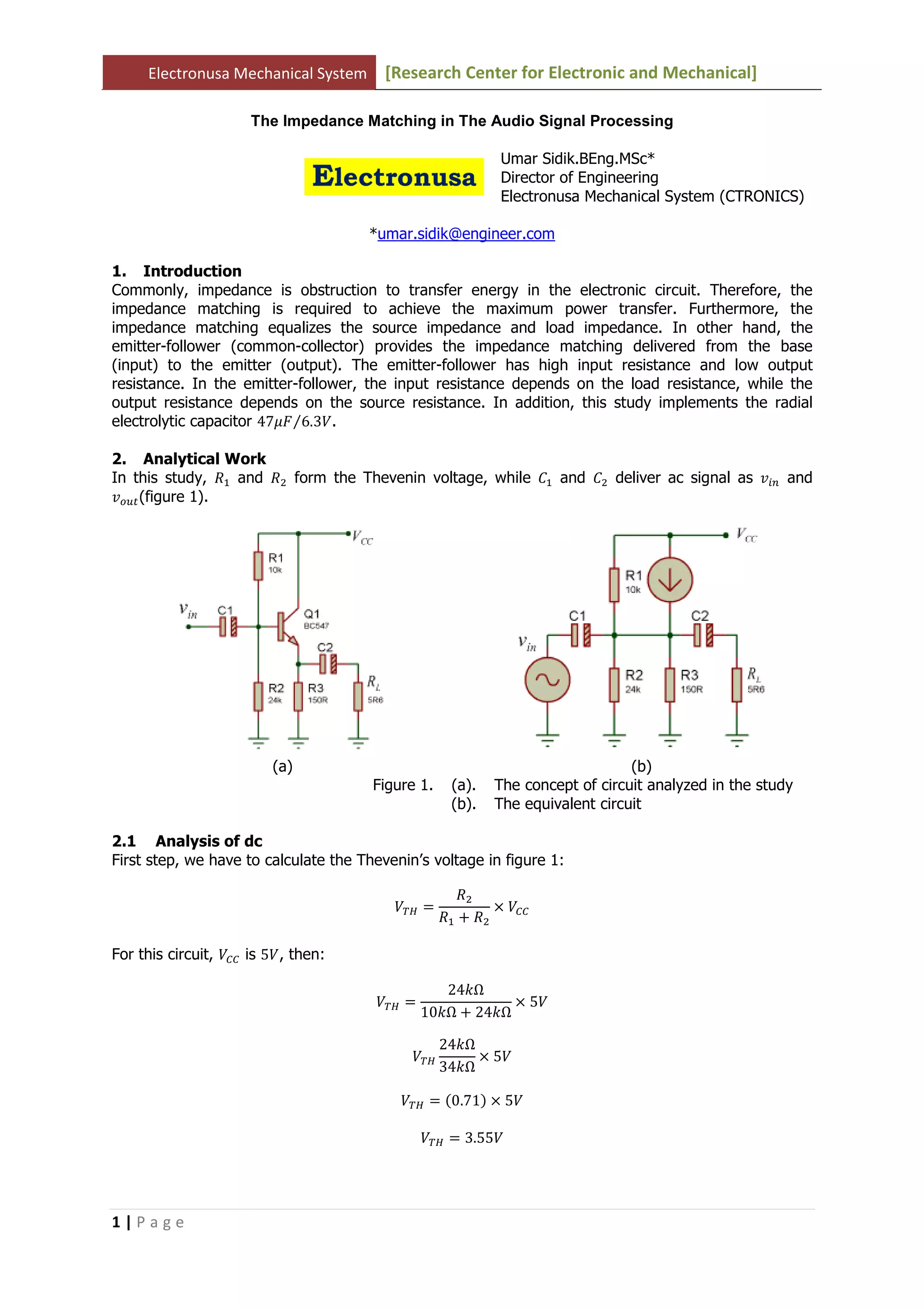 This document discusses impedance matching in audio signal processing. It analyzes a circuit both analytically and through simulation. The analytical work calculates values like Thevenin voltage, dc voltage, and currents. The simulation is then compared to the analytical work. For dc analysis, the Thevenin voltage and dc voltage match within 18-21%. For ac analysis, the input and output currents match the analytical work within 91%. This analysis helps verify the circuit design through both mathematical and simulated approaches.