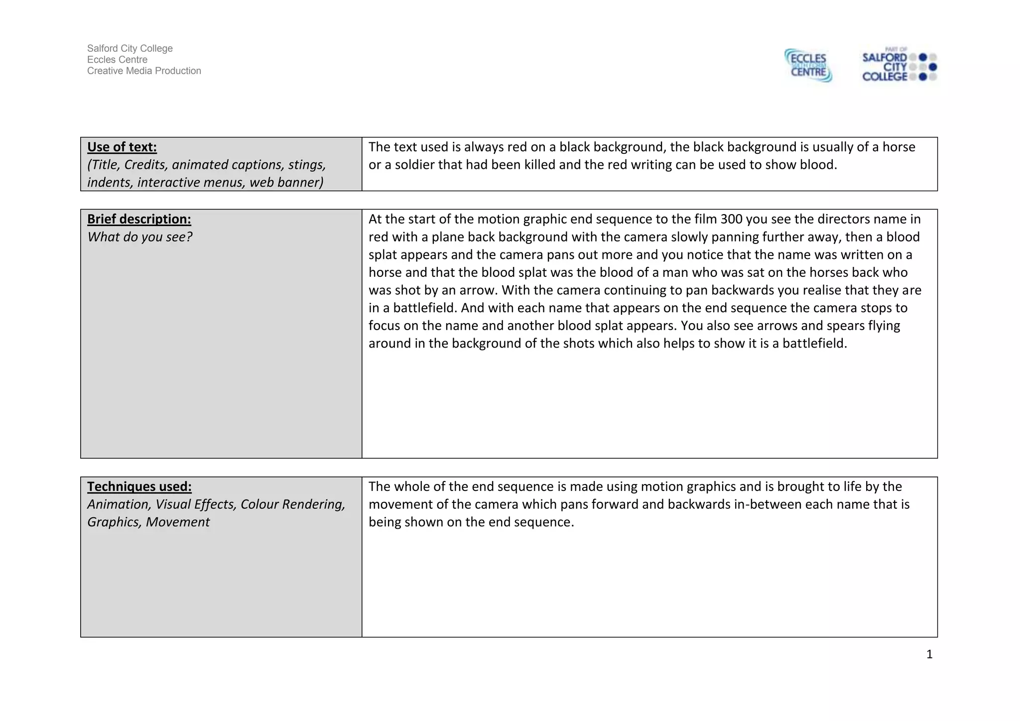 The end credits sequence of the film 300 uses motion graphics and animation techniques. The text is always red on a black background, which is usually an image of a dead horse or soldier. As each name appears in the credits, the camera pans out to reveal more of the battlefield scene. Arrows and spears are seen flying around in the background. The sequence uses techniques like animation, visual effects, color rendering and movement to bring the graphics to life as the camera pans between each name. Rotation is used to show arrows and spears moving toward people. The format is 1080p HD at 50 frames per second.