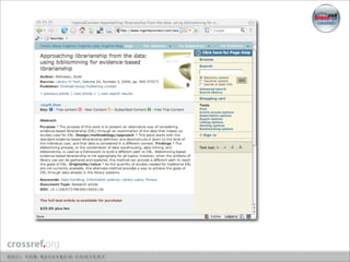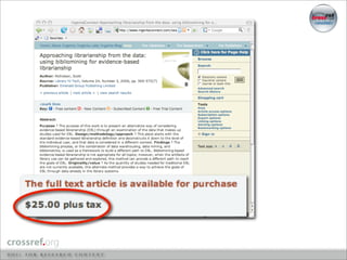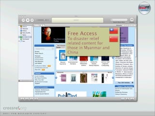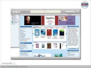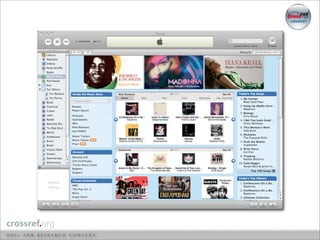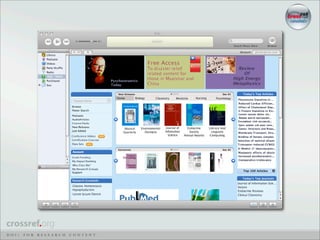 This document summarizes a presentation comparing the iTunes music store model to potential models for online scholarly publishing ("iPub"). It notes that while scholarly publishing shares iTunes' large user base and ability to provide individual articles, it lacks iTunes' simple pricing, low prices, and integration with a popular device (iPod). The presentation argues scholarly publishing needs to simplify pricing models, offer lower prices per article, and potentially integrate with common researcher tools to emulate iTunes' success.