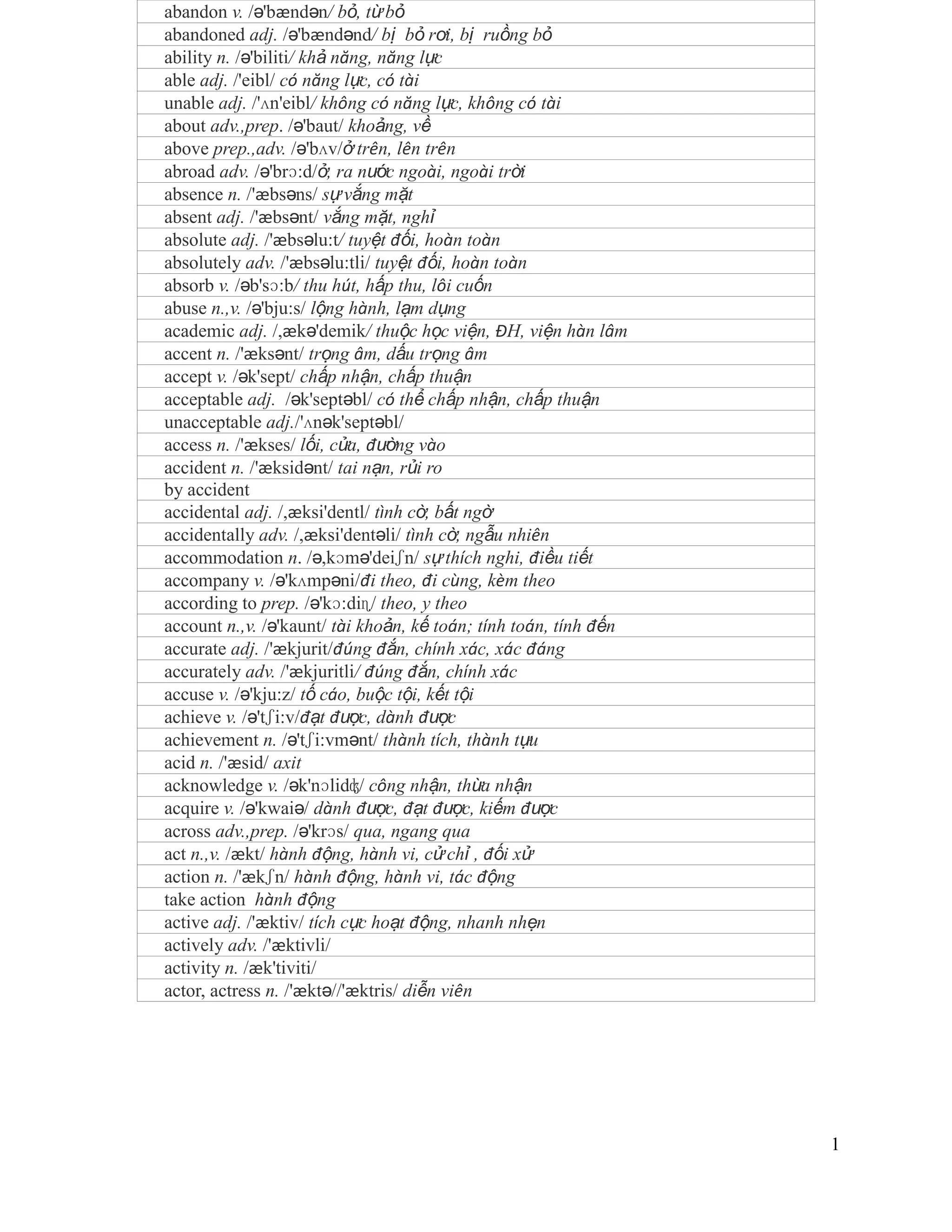 Tài liệu cung cấp danh sách các từ tiếng Anh, bao gồm nghĩa và cách phát âm của từng từ. Nó bao gồm nhiều loại từ như động từ, danh từ, tính từ và trạng từ. Danh sách này hữu ích cho việc học từ vựng và cải thiện tiếng Anh.