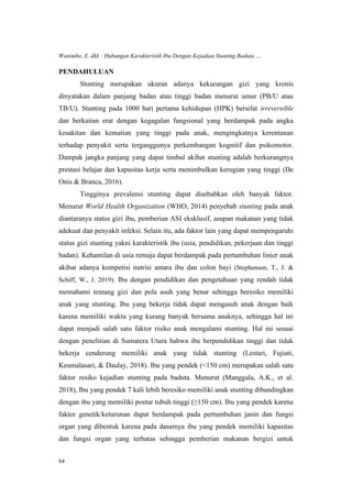 Penelitian ini mengungkapkan adanya hubungan signifikan antara usia ibu dan kejadian stunting pada anak usia 7-24 bulan, dengan p-value 0,003. Stunting terjadi lebih banyak pada anak dari ibu yang hamil di usia remaja (<20 tahun), sementara faktor seperti tinggi badan, pendidikan, dan pekerjaan ibu tidak menunjukkan hubungan yang signifikan. Prevalensi stunting di Kabupaten Tolikara mencapai 41% pada tahun 2017, menjadikannya sebagai masalah gizi utama.