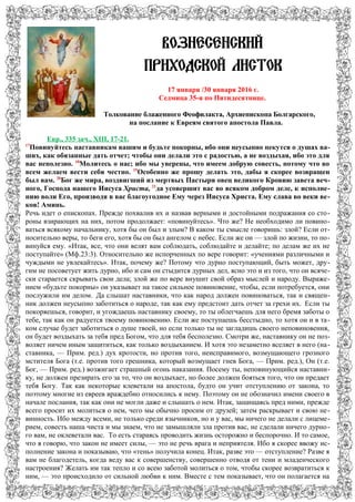 Документ представляет собой религиозное толкование Послания к Евреям и Евангелия от Луки, где акцентируется внимание на важности повиновения духовным наставникам и внутреннем духовном состоянии верующих. Основное послание заключается в том, что истинное блаженство достигается через смирение, покаяние и стремление к праведности, а не через земные блага. В заключение подчеркивается, что блаженные, испытывающие гонения за веру, будут вознаграждены на небесах.
