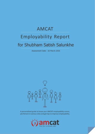 The document provides guidance on interpreting an AMCAT employability report. It discusses reading the report summary to understand overall scores and strengths. It emphasizes using the profile and industry fitment chapter to create an action plan, such as preparing for interviews in high-fit areas, exploring medium-fit areas of interest, and improving skills in medium-fit areas of interest. Finally, it recommends using other chapters to identify weaknesses and references for skill improvement.