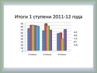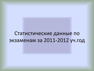 Документ содержит статистические данные об итогах экзаменов за учебный год 2011-2012, включая средние баллы по различным предметам и результаты ЕГЭ. Также представлены сведения о медалистах и призерах на региональных этапах Всероссийской олимпиады. В заключение указаны лучшие учителя и победители НПК по предметам.