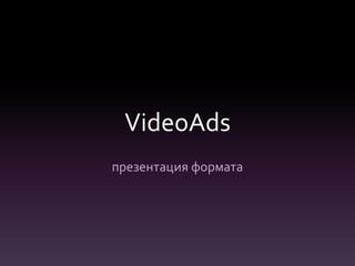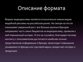 Документ описывает формат видеорекламы videoads, который демонстрирует рост популярности на российском рынке. Он выделяет преимущества формата, такие как высокая вовлеченность пользователей, креативность и экономия бюджета, а также содержит технические требования и настройки для показа рекламы. Документ также упоминает партнерские площадки для размещения видеорекламы с общей аудиторией в 75 миллионов пользователей.