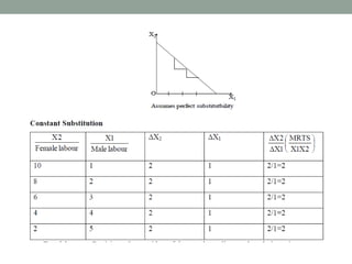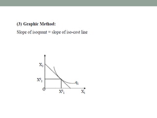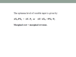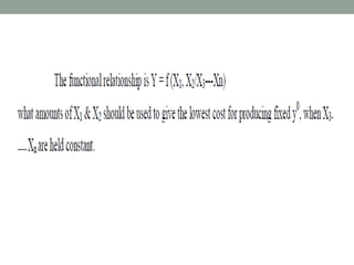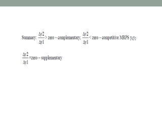 - Factor-product and factor-factor relationships, and how inputs can be substituted or combined in fixed proportions.