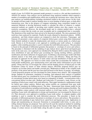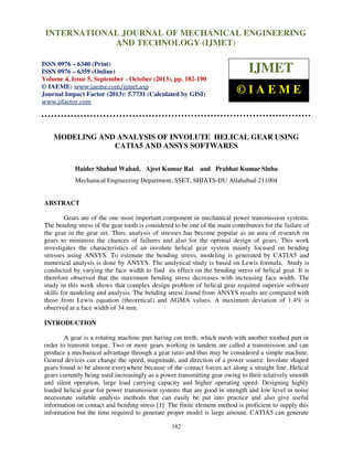 This document summarizes a study on modeling and analyzing an involute helical gear using CATIA and ANSYS software. It begins with an introduction to gears and motivation for using numerical analysis methods. It then describes how a helical gear model was generated in CATIA and its stresses were analyzed using ANSYS. Bending stresses from ANSYS were compared to theoretical Lewis equation values and AGMA standards, showing maximum 1.4% deviation. Face width was varied and stresses decreased with increasing width. Overall, complex gear designs require advanced software for accurate modeling and stress analysis to optimize design and prevent failures.