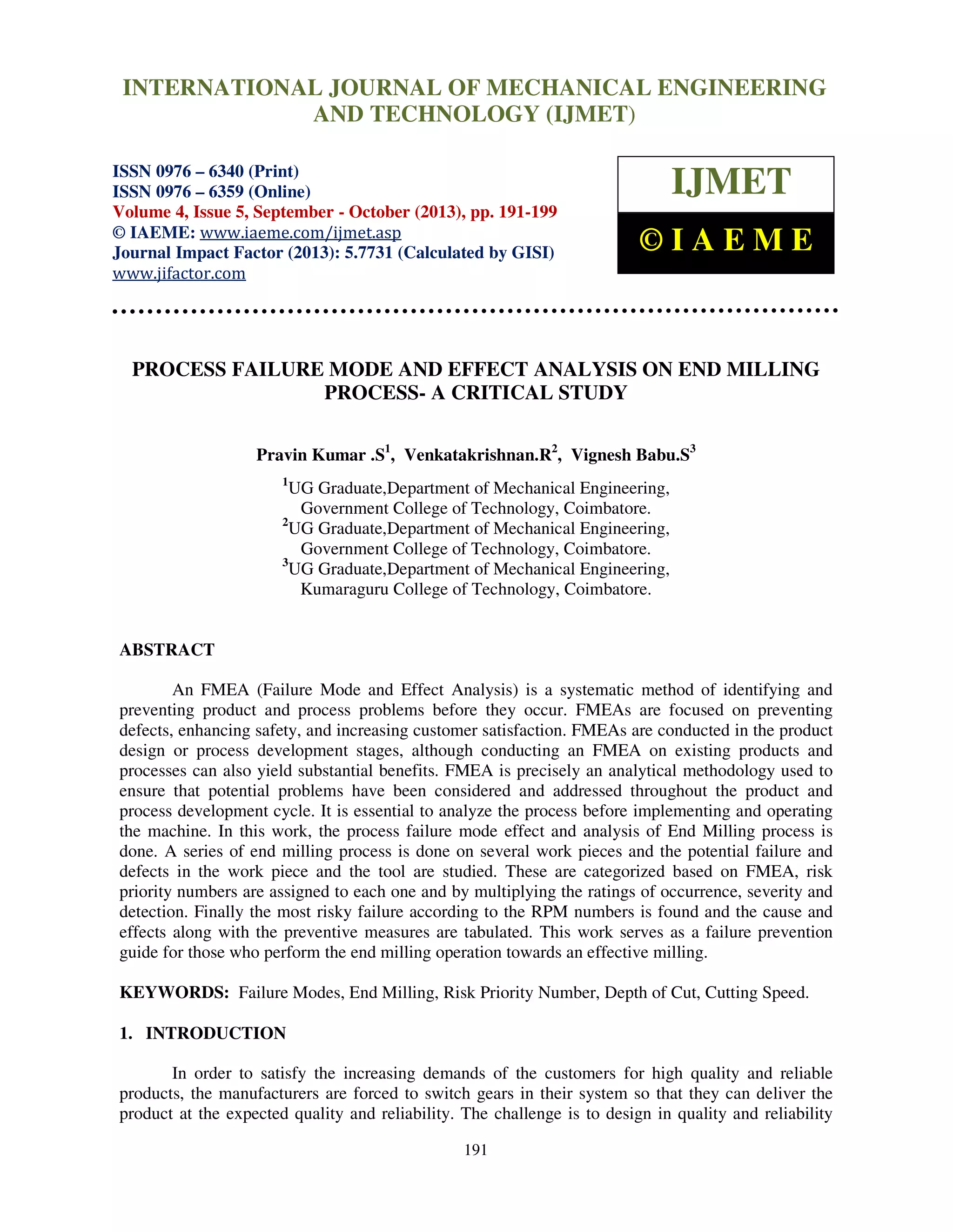 The document summarizes a study on performing a Process Failure Mode and Effect Analysis (FMEA) on an end milling process. The researchers conducted multiple end milling trials and identified several potential failure modes and their effects. They assigned severity, occurrence, and detection ratings to each failure mode and calculated Risk Priority Numbers. The failure mode with the highest RPN, which was chip packing, was further analyzed to identify causes and recommend preventive measures like adjusting feed or speed. The FMEA provides a guide to prevent failures and improve the effectiveness of end milling operations.