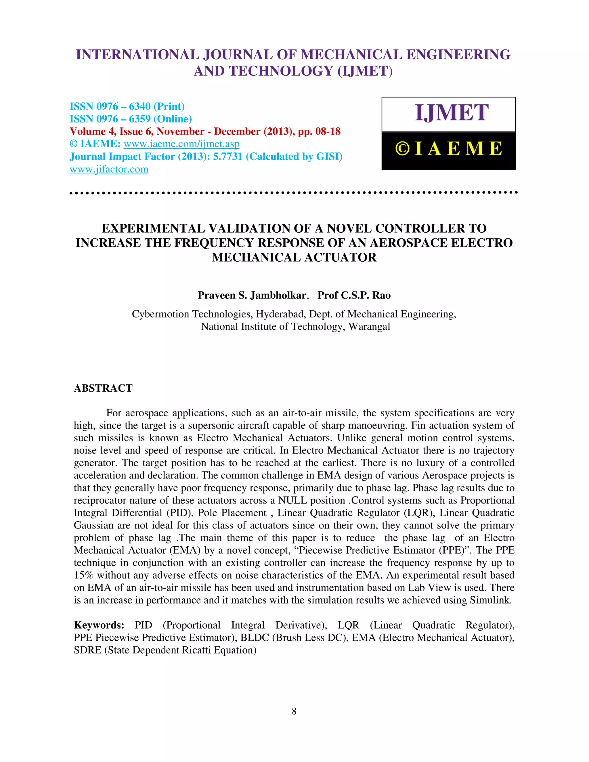 The document describes an experiment to validate a novel controller called a Piecewise Predictive Estimator (PPE) that aims to increase the frequency response of an aerospace electro-mechanical actuator (EMA) by reducing phase lag. The experiment showed that combining a PID controller with PPE increased the EMA's bandwidth from 22Hz to 25Hz without increasing noise levels, validating that PPE successfully enhances EMA performance by reducing phase lag at higher frequencies. The document also provides background on EMA modeling and design challenges, and discusses PID, LQR, and PPE controller design approaches.