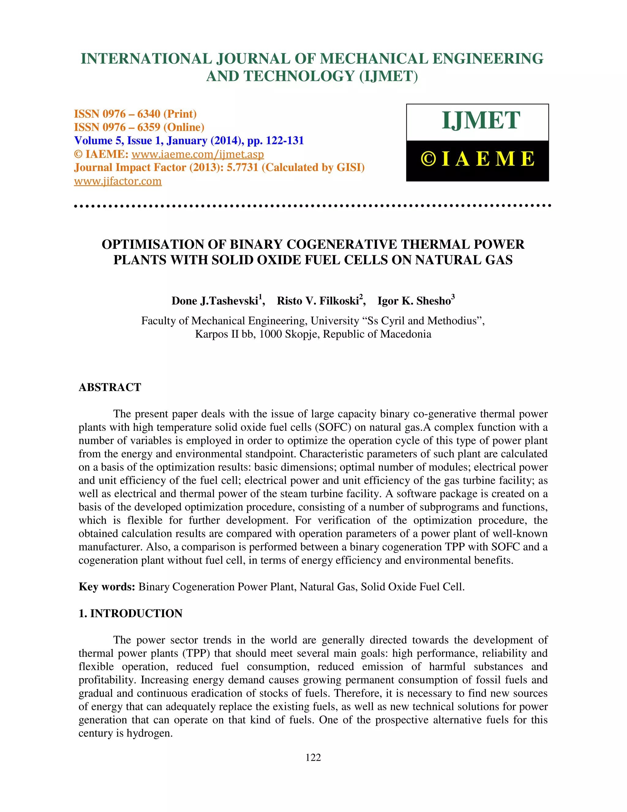 This document discusses optimizing the operation of binary cogenerative thermal power plants with solid oxide fuel cells (SOFC) that run on natural gas. It introduces SOFC technology and describes a model power plant that uses tubular SOFC modules from Siemens-Westinghouse to generate electricity. The power plant also includes a gas turbine and steam turbine to maximize energy efficiency. The document establishes a complex optimization function involving numerous variables that impact the plant's overall exergy efficiency. These variables relate to parameters of the SOFC, gas turbine, steam turbine and plant operation. The goal of optimization is to determine the optimum values for these variables to achieve maximum exergy efficiency from the integrated power plant system.
