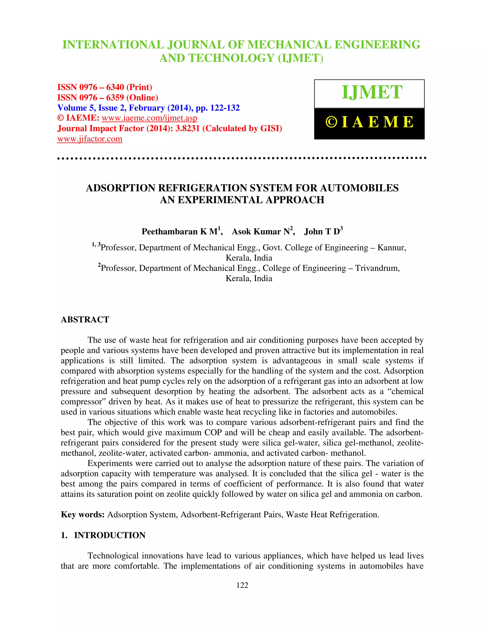 The document describes an experimental study on adsorption refrigeration systems for automobiles. Various adsorbent-refrigerant pairs were tested including silica gel-water, silica gel-methanol, zeolite-methanol, zeolite-water, activated carbon-ammonia, and activated carbon-methanol. Experiments were conducted to analyze the adsorption capacity of each pair at different temperatures. It was found that silica gel-water had the highest coefficient of performance and was the best pair among those tested. Water also reached saturation on zeolite the quickest, followed by water on silica gel and ammonia on carbon. The goal of the study was to evaluate different pairs to