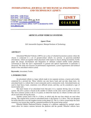 This document summarizes the design, development, and integration of a customized vibration isolated mobile trailer platform to meet optical requirements. The articulated vehicle system discussed includes a well bed full trailer with air bag suspension, auto leveling system, EMI shielded control room, 3-axis alignment system, metal sliding canopy, vibration isolation system, and nitrogen gas purging system. The study focuses on the performance requirements, system requirements, and technical details of integrating these sub-systems into the articulated vehicle to transport and align optical payloads over varied terrain while minimizing vibration.