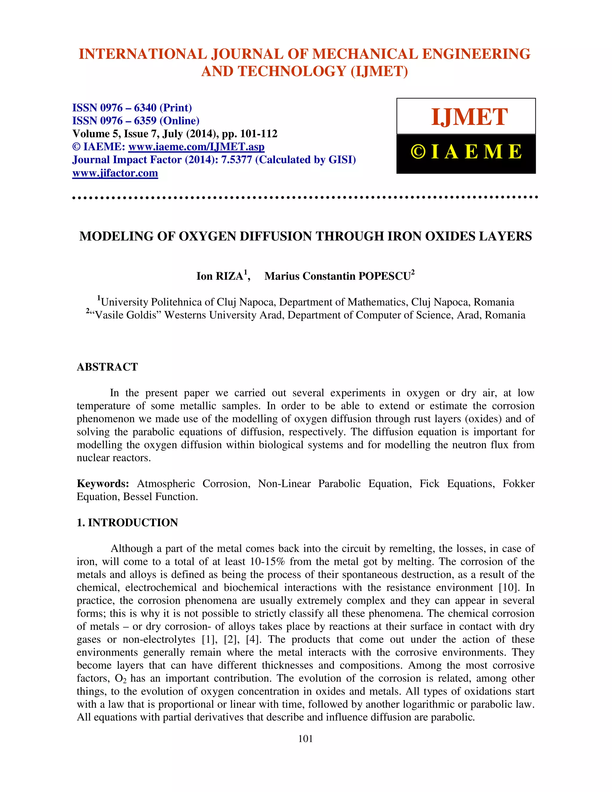 The document discusses experiments related to the modeling of oxygen diffusion through rust layers at low temperatures using mathematical equations, particularly focusing on parabolic partial derivatives. It highlights the complexity of corrosion processes in metals, the stability of iron oxides, and various mathematical approaches to deriving diffusion equations. The findings integrate factors such as oxygen concentration's role in corrosion evolution and the application of diffusion models in biological systems and nuclear reactors.