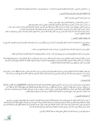 اﻟﻤﻄﻠﻮﺑﺔ اﻟﻤﯿﺎه ﻛﻤﯿﺔ)اﻟﺮﺷﺎﺷﺎت+اﻟﺤﺮﯾﻖ ﺧﺮاﻃﯿﻢ+ (اﻟﻤ ﻛﻤﯿﺔاﻟﻌﺎم ﻟﻼﺳﺘﮭﻼك اﻟﻤﻄﻠﻮﺑﺔ ﯿﺎه. 4-اﻷرﺿﻲ اﻟﻤﯿﺎه ﺧﺰان ﻋﻠﻰ ﺗﺮﻛﺐ اﻟﺘﻲ اﻟﻤﻠﺤﻘﺎت: اﻵﺗﯿﺔ ﺑﺎﻟﻤﻮاﺳﯿﺮ اﻷرﺿﻲ اﻟﻤﯿﺎه ﺧﺰان ﯾﺰود: أ–ﻋﻮاﻣﺔ ﻣﺤﺒﺲ ﻋﻠﯿﮭﺎ وﯾﺮﻛﺐ اﻟﻌﺎﻣﺔ اﻟﺸﺒﻜﺔ ﻣﻦ اﻟﺨﺰان ﺗﻐﺬﯾﺔ ﻣﺎﺳﻮرة. ب-اﻟﻌﻠﻮي ﻟﻠﺨﺰان ﻟﺮﻓﻌﮫ اﻟﻀﺦ ﻣﺠﻤﻮﻋﺔ ﺑﻮاﺳﻄﺔ اﻟﺨﺰان ﻣﻦ اﻟﻤﺎء ﺳﺤﺐ ﻣﺎﺳﻮرةﻗﻔﻞ ﻣﺤﺒﺲ ﻋﻠﯿﮭﺎ وﯾﺮﻛﺐ. ج-ﺳﺎﻣﺔ وﻏﯿﺮ اﻟﺼﺪأ ﺿﺪ ﺑﻤﺎدة ﻟﻠﻤﯿﺎه اﻟﻤﻼﺻﻘﺔ اﻟﺤﺪﯾﺪﯾﺔ اﻟﻤﻮاﺳﯿﺮ دھﺎن ﻣﻼﺣﻈﺔ ﻣﻊ ﻗﻔﻞ ﺻﻤﺎﻣﺎت ذات ﻏﺴﯿﻞ ﺻﺮف وﺧﻄﻮط ﻓﺎﺋﺾ ﻣﺎﺳﻮرة. -ﺗﮭﻮﯾﺔ ﻣﺎﺳﻮرة ﺗﺮﻛﺐ)ﺣﻮاﻟﻲ ﻗﻄﺮ2ﺑﻮﺻﺔ(اﻟﺤﺸﺮات دﺧﻮل ﻟﻤﻨﻊ ﺳﻠﻚ ﺷﺒﻚ ﻧﮭﺎﯾﺘﮭﺎ ﻓﻲ أﺳﻔﻞ إﻟﻰ وﺑﻜﻮع اﻟﺨﺰان ﺑﺴﻘﻒ. -ﺗﺮأﻋﻤ ﻹﺟﺮاء ﻣﻨﮭﺎ واﻟﺨﺮوج ﻟﻠﺨﺰاﻧﺎت اﻟﺪﺧـﻮل ﻟﺘﺴﮭﯿﻞ ﺳﺎﻣﺔ وﻏﯿﺮ ﻟﻠﺼﺪأ ﻣﻘﺎوﻣﺔ ﺗﻜﻮن ﻣﻮاد ﻣﻦ ﺑﺤﺎري ﺳﻼﻟﻢ اﻷرﺿﯿﺔ اﻟﻤﯿﺎه ﺧﺰاﻧﺎت داﺧﻞ ﻛﺐﺎل اﻟﺪورﯾﺔ واﻟﺘﻄﮭﯿﺮ اﻟﺼﯿﺎﻧﺔ 5-واﻻﺧﺘﺒﺎر اﻟﺘﻨﻔﯿﺬ ﻣﺘﻄﻠﺒﺎت: -ﻟﻠﻜﺒﺮﯾﺘﺎت اﻟﻤﻘﺎوم اﻷﺳﻤﻨﺖ اﻟﺨﺰاﻧﺎت ھﺬه ﺑﻨﺎء ﻓﻲ ﯾﺴﺘﺨﺪم)ﻧﻮع اﻷﺳﻤﻨﺖ(V) )اﻷﻣﺮﯾﻜﻲ واﻟﺘﺼﻨﯿﻒ اﻟﺴﻌﻮدﯾﺔ اﻟﻘﯿﺎﺳﯿﺔ ﺑﺎﻟﻤﻮاﺻﻔﺎت ﺟﺎء ﻣﺎ ﺣﺴﺐ( ASTM ). -اﻟﻤﯿﺎه ﺗﺴﺮب ﻟﻤﻨﻊ اﻟﻤﺴﺘﻌﻤﻠﺔ اﻟﻤﻮاد ﻣﻦ ﻏﯿﺮھﺎ أو اﻹﯾﺒﻮﻛﺴﻲ ﺑﻤﺎدة اﻟﺨﺰاﻧﺎت وأرﺿﯿﺎت ﺟﺪران ﺗﻄﻠﻰ. -ﻓﺘﺤ ﺟﻤﯿﻊ ﺑﺈﺣﻜﺎم ﺗﺴﺪ ﻛﻤﺎ ، اﻟﺒﻨﺎء ﻓﻮاﺻﻞ ﺟﻤﯿﻊ ﺑﯿﻦ اﻟﺘﺴﺮب ﻟﻤﻨﻊ وﻗﻮاﻃﻊ ﻟﻠﻤﯿﺎه ﻋﻮازل ﺗﻮﺿﻊاﻟﺘﻨﻔﯿﺬ ﻓﻲ اﻟﻤﺴﺘﻌﻤﻠﺔ واﻟﻔﺘﺤﺎت اﻟﺴﺒﺎﻛﺔ ﺎت. -ﻃ ﻓﻮﻗﮭﺎ وﺗﻮﺿﻊ ، ًاﺟﯿﺪ اﻟﻤﺪﻛﻮك اﻟﺮﻛﺎم ﻣﻦ ﻃﺒﻘﺔ ﻋﻠﻰ واﺣﺪ ﻣﺘﺮ ﻣﻦ ﺑﺄﻛﺜﺮ اﻷرﺿﯿﺔ اﻟﻤﯿﺎه ﻣﻨﺴﻮب ﻓﻮق واﻗﻌﺔ ﻛﺎﻧﺖ إذا اﻷرﺿﯿﺔ ﺑﻼﻃﺔ ﺗﺆﺳﺲﻣﺎﻧﻌﺔ ﺒﻘﺔ اﻷر ﻟﻠﻤﯿﺎه اﻟﻤﺘﻮﻗـﻊ اﻟﻤﻨﺴﻮب ﺗﺤﺖ واﻗﻌﺔ اﻷرﺿﯿﺔ ﺑﻼﻃﺔ ﻛﺎﻧﺖ إذا أﻣﺎ ، ﻟﻠﺮﻃﻮﺑﺔاﻟﺨﺎرﺟﯿﺔ اﻟﻮﺟـﻮه وﺟﻤﯿﻊ اﻟﺒﻼﻃﺔ ھﺬه ﺗﻐﻄﯿﺔ ﻓﯿﺠﺐ ﻣﻨﮫ ﻗﺮﯾﺒﺔ أو ﺿﯿﺔ ﺑﺎﻷﺳﻔﻠﺖ اﻟﻤﺸﺒﻌﺔ اﻟﻌﺎزﻟﺔ اﻷﻏﺸﯿﺔ ﻣﻦ ﻃﺒﻘﺘﯿﻦ ﻋﻦ ﯾﻘﻞ ﻻ ﺑﻤﺎ ﻟﻠﺨﺰان. -ﻟﻤﺪة ﺑﺎﻟﻤﺎء اﻟﺨﺰان ﺑﻤﻞء وذﻟﻚ واﻟﺮدم اﻟﺨﺎرﺟﻲ اﻟﻌﺰل وﻗﺒﻞ ﺗﻨﻔﯿﺬھﺎ اﻧﺘﮭﺎء ﺑﻌﺪ اﻟﺨﺰان ﻓﻲ اﻟﺪاﺧﻠﯿﺔ اﻟﻌﺎزﻟﺔ اﻟﻄﺒﻘﺎت اﺧﺘﺒﺎر ﯾﺘﻢ48أﺳﺒﺎب وﻋﻼج ، ﺳﺎﻋﺔ ﺗﻨﻔﯿﺬه ﺑﻌﺪ اﻟﺨﺎرﺟﻲ اﻟﻌﺰل اﺧﺘﺒﺎر ﯾﺘﻢ ﺛﻢ واﻟﺮدم اﻟﺨﺎرﺟﻲ اﻟﻌﺰل ﻓﻲ اﻟﺒﺪء ﻗﺒﻞ وﺟﻮده ﯾﺘﺒﯿﻦ رﺷﺢ أو ﺗﺴﺮب أيًﺎﺗﻤﺎﻣ اﻟﻤﺎء ﻣﻦ اﻟﺨﺰان ﺗﻔﺮﯾﻎ ﺑﻌﺪ وذﻟﻚ ﻟﯿﺠﻒ وﺗﺮﻛﮫ. 6-اﻟﺮدﻣﯿــﺎت: اﻹﻧﺸﺎﺋﻲ اﻟﺮدم ﻧﻮع ﻣﻦ ﻣﻮاد اﻟﺨﺰان ﺣﻮل اﻟﺮدم ﻓﻲ ﯾﺴﺘﺨﺪم)ﻣﻨﺘﻘﻰ(ﻃﺒﻘﻟﻠﻄﺮق اﻷﻣﺮﯾﻜﯿﺔ اﻟﻘﯿﺎﺳﯿﺔ ﻟﻠﻤﻮاﺻﻔﺎت ًﺎAASHTOرﻗﻢ1)-(Aأو2)-(A ﻣﻨﮭﺎ ﻛﻞ ﺳﻤﻚ ﯾﺘﺠﺎوز ﻻ ﻃﺒﻘﺎت ﻋﻠﻰ اﻟﺮدم وﯾﺘﻢ ، ﯾﻌﺎدﻟﮭﺎ ﻣﺎ أو20ﻋﻦ ﺗﻘﻞ ﻻ ﻛﺜﺎﻓﺔ ﺗﺤﻘﯿﻖ ﺣﺘﻰ ﻣﯿﻜﺎﻧﯿﻜﯿﺔ ﺑﻄﺮﯾﻘﺔ ﻃﺒﻘﺔ ﻛﻞ دك وﯾﺘﻢ ، ﺳﻢ95ﻣﻦ ٪ اﺧﺘﺒﺎر ﺑﻄﺮﯾﻘﺔ اﻟﻜﺜﺎﻓﺔ ھﺬه ﺗﻘﺎس أن ﻋﻠﻰ اﻟﺠﺎﻓﺔ اﻟﻌﻈﻤﻰ اﻟﻜﺜﺎﻓﺔﻓﻲ ﺧﺒﺮة ذو ﻣﺘﺨﺼﺺ ﻓﻨﻲ اﻟﺮدم ﻋﻤﻠﯿﺔ ﺗﻨﻔﯿﺬ ﻋﻠﻰ ﯾﺸﺮف أن وﯾﺘﻌﯿﻦ ، اﻟﻤﻌﺪل ﺑﺮوﻛﺘﻮر ﺑﺎﻧﺘﻈﺎم ﻧﺘﺎﺋﺠﮭﺎ وﺗﺴﺠﯿﻞ اﻟﺮدم ﺟﻮدة ﻣﻦ ﻟﻠﺘﺄﻛﺪ اﻟﻼزﻣﺔ اﻟﻤﯿﺪاﻧﯿﺔ اﻻﺧﺘﺒﺎرات ﺟﻤﯿﻊ إﺟﺮاء ﯾﺘﻌﯿﻦ ﻛﻤﺎ ، اﻷﻋﻤﺎل ھﺬه. 7-اﻟﺘﺼﻤﯿﻢ اﺷﺘﺮاﻃﺎت: أ-اﻟﺨﺮﺳﺎﻧ ﺗﺼﻤﯿﻢ ﻋﻨﺪ اﻟﻔﻨﯿﺔ اﻷﺻﻮل ﻣﺮاﻋﺎة ﯾﺠﺐﺑﯿﻦ ﻣﺎﺋﻲ ﺗﺴﺮب ﻣﺎﻧﻊ ﯾﻌﻤﻞ ﺗﻨﻔﯿﺬھﺎ وﻋﻨﺪ اﻷرﺿﯿﺔ اﻟﺨﺰاﻧﺎت وﺣﻮاﺋﻂ أرﺿﯿﺔ ﻟﺒﻼﻃﺔ اﻟﻤﺴﻠﺤﺔ ﺎت اﻷرﺿ ﻟﺒﻼﻃﺔ واﻷﻓﻘﻲ ﻟﻠﺤﻮاﺋﻂ اﻟﺮأﺳﻲ اﻟﺤﺪﯾﺪ ﺑﻮﺻﻼت اﻟﻌﻨﺎﯾﺔ وأﯾﻀﺎ اﻟﺮأﺳﯿﺔ واﻟﺤﻮاﺋﻂ اﻷرﺿﯿﺔ ﺑﻼﻃﺔ ﺑﯿﻦ ﻓﯿﻤﺎ وﺧﺎﺻﺔ اﻟﻤﺨﺘﻠﻔﺔ اﻟﺼﺒﺎتواﻟﺤﻮاﺋﻂ ﯿﺔ وﻣﺄ ًﺎﺳ