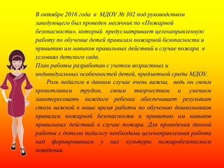 Документ описывает работу муниципального дошкольного образовательного учреждения по обучению детей правилам пожарной безопасности, акцентируя внимание на роли педагогов в формировании культуры безопасного поведения. В октябре 2016 года был проведён месячник, включавший занятия, викторины и развлекательные мероприятия, направленные на развитие навыков безопасного поведения при пожаре. Также предусмотрена работа с родителями через размещение рекомендаций и организацию совместных мероприятий.