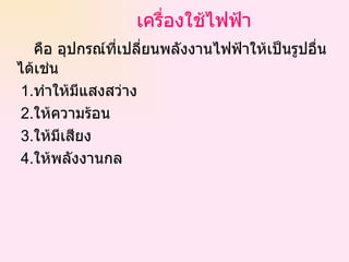 เครื่องใช้ไฟฟ้า จัดทำโดย 1. ด . ช . ธนาณัติ ใจยืน ชั้น ม .3/4 เลขที่ 10 2. ด . ช . รุสมัน เรือนมูล ชั้น ม .3/4 เลขที่ 16 3. ด . ช . อนุนาท ปิงอ้อย ชั้น ม .3/4 เลขที่ 19 4. ด . ญ . รวิวรรณ ใจเย็น ชั้น ม .3/4 เลขที่ 28 เสนอ ครู จิราภรณ์ ไชยมงคล โรงเรียนฟากกว๊านวิทยาคม - 2.