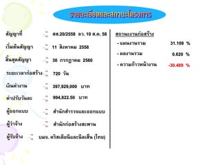 ส.ค. 58 เริ่มต้นสัญญา 11 สิงหาคม 2558 สิ้นสุดสัญญา 30 กรกฎาคม 2560 ระยะเวลาก่อสร้าง 720 วัน สัญญาที่ 397,929,000 บาท ค่าปรับวันละ 994,822.50 บาท ผู้ว่าจ้าง สานักก่อสร้างสะพาน ผู้ออกแบบ สานักสารวจและออกแบบ ผู้รับจ้าง บมจ. คริสเตียนีและนีลเส็น (ไทย) เงินค่างาน สถานะงานก่อสร้าง - แผนงานรวม - ผลงานรวม 31.109 % 0.620 % - ความก้าวหน้างาน -30.489 %