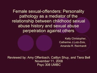 The study examined reasons for the link between childhood sexual abuse (CSA) and later sexual abuse perpetration in women. It found that female prisoners convicted of sexually abusing children reported more frequent CSA and longer abuse durations than other prisoners. While CSA was linked to borderline personality traits, these traits did not distinguish between sexual offenders and other criminals. Duration of CSA, rather than just the occurrence, appeared to be a stronger predictor of later sexually offending. The results suggest exposure to prolonged CSA as a child may increase the likelihood that such relationships are viewed as normal and replicated later.